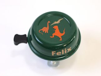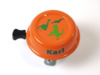 Die Fahrradklingel Dino hat einen Zahnantrieb aus nichtrostendem Kunststoff. Die rotierenden und beweglichen Metallscheiben erzeugen – sowohl bei der Druckbewegung, wie auch bei der Rückwärtsbewegung – satte, klare und freundliche Klingeltöne. Das Design und der Namens-Schriftzug sind gefertigt aus qualitativ hochwertiger und witterungsbeständiger Folie. Bei der Variante „Weiß (phosphoreszierend) auf Schwarz“ verwenden wir eine Spezial-Folie, die im Dunklen nachleuchtet!